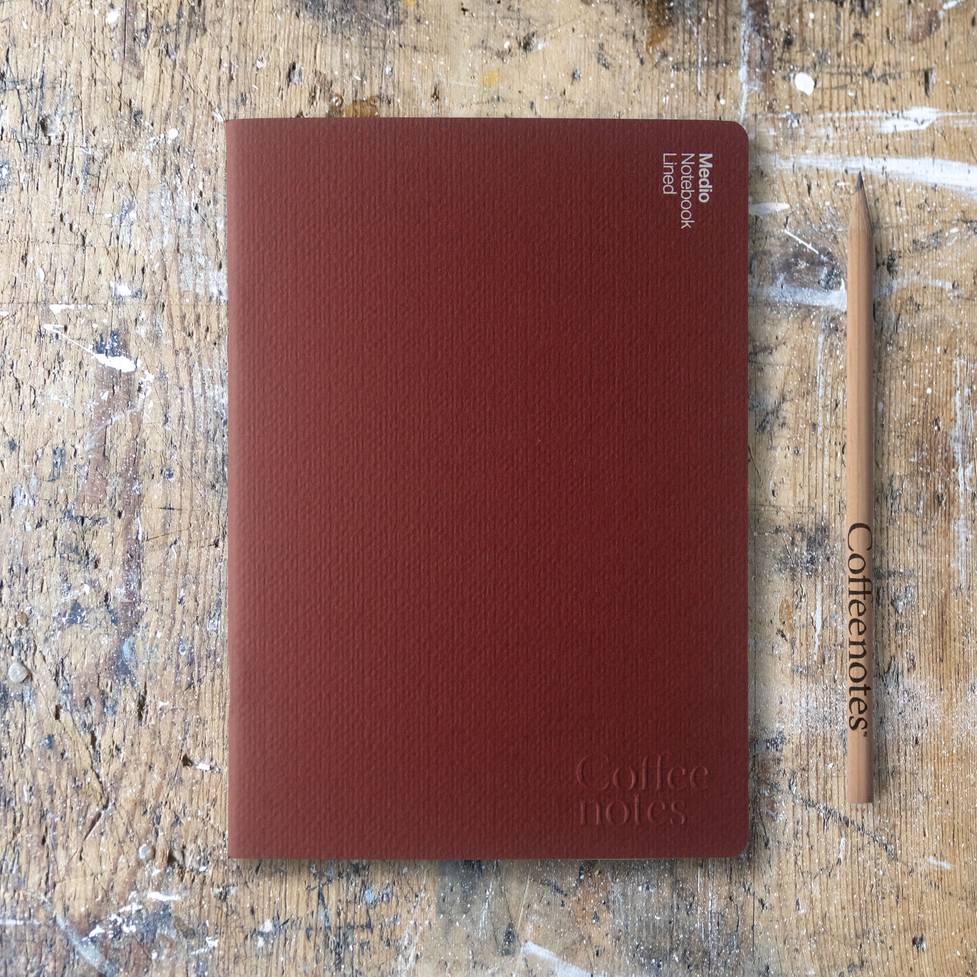 Our stitched sustainable notebooks are made from our {re}cycled coffeecup paper. The beautifully minimal Burgundy cover is made from a mixture of {re}cycled, cotton and FSC fibres, is part of the Classic Collection, and is available in Medio size.