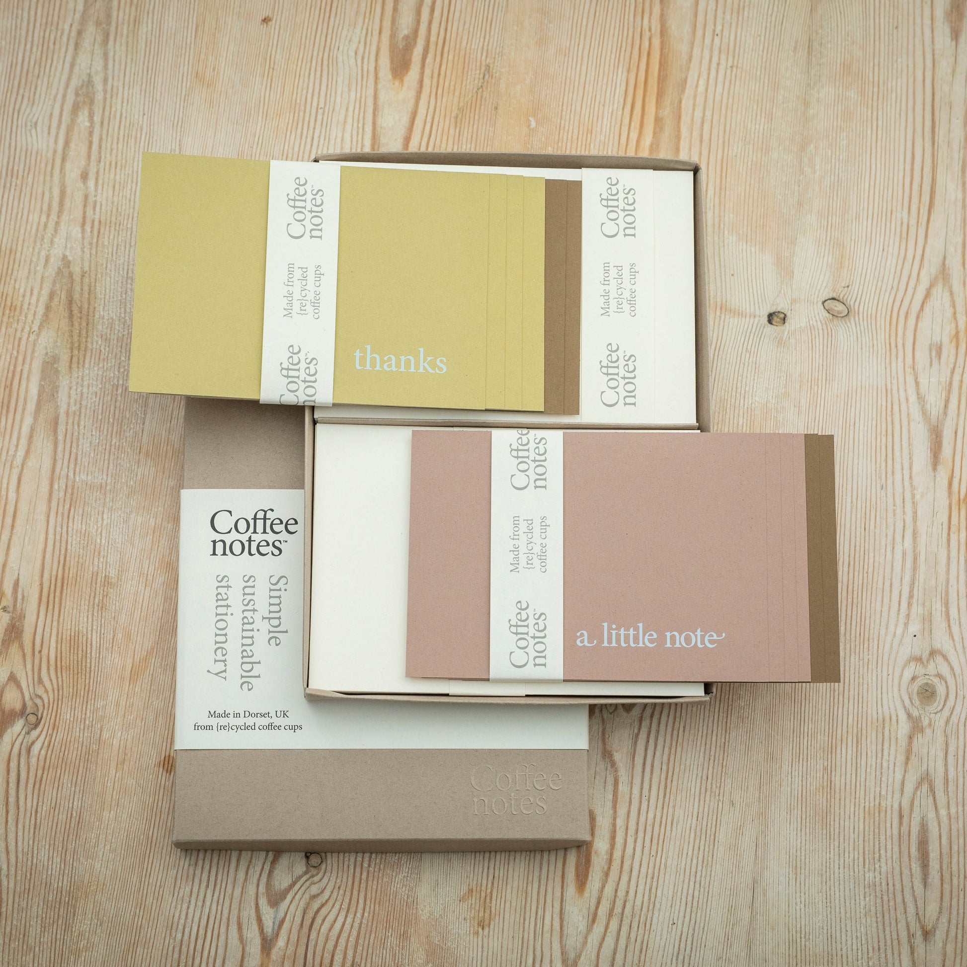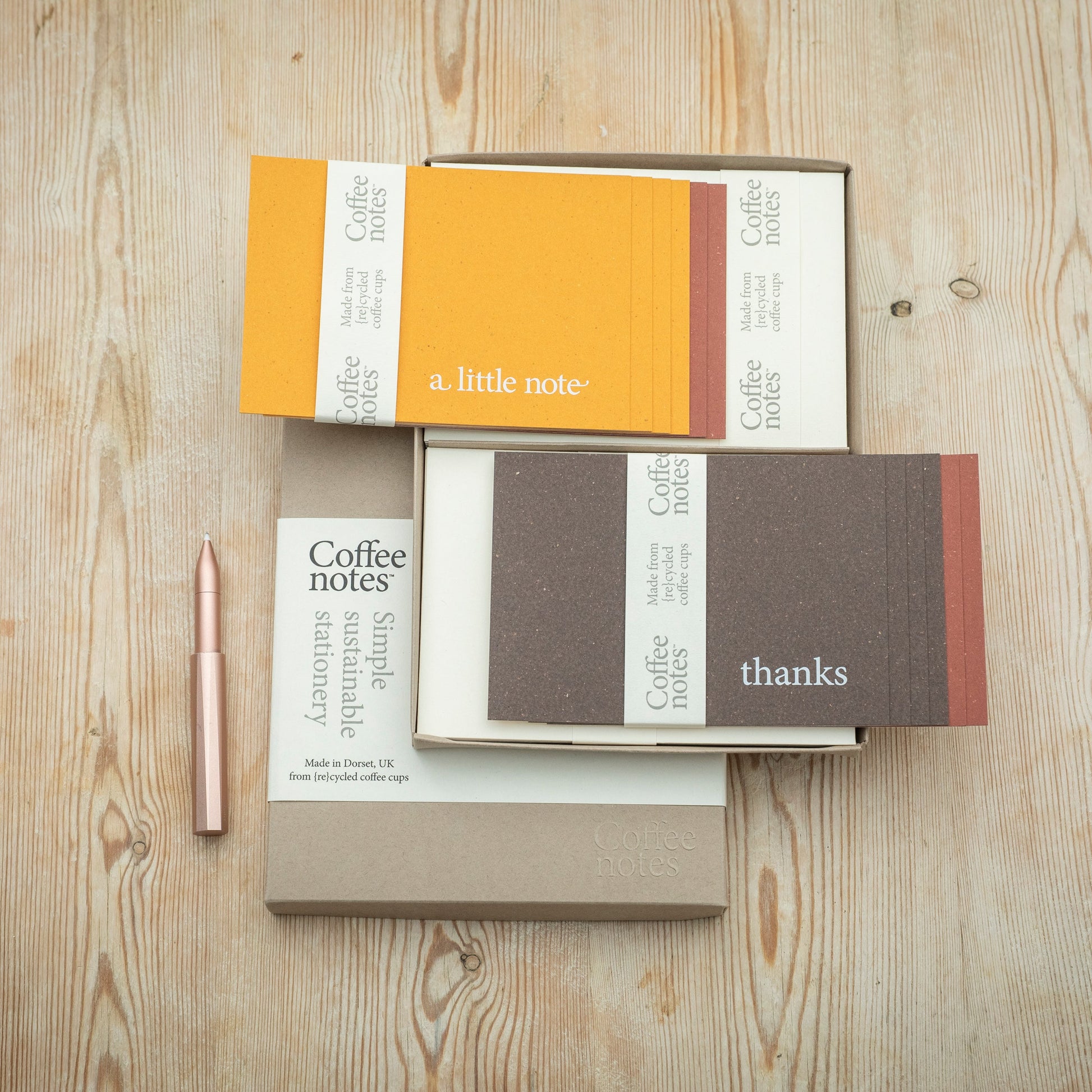 Boxed with envelopes made from our bespoke recycled coffeecup paper. Saying you care doesn't have to cost the planet. Choose your favourite colour collection - Nut, Beer or Tailor's.